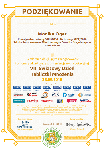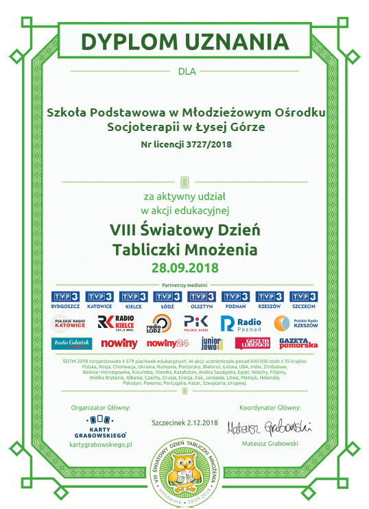 Dnia 28.09.2018 r uczniowie Szkoły Podstawowej oraz Gimnazjum obchodzili VIII Światowy Dzień Tabliczki Mnożenia pod hasłem „Młodsi sprawdzają, czy starsi tabliczkę mnożenia znają!”. Szkoła Podstawowa w Naszym Ośrodku była organizatorem lokalnym tej akcji, której organizatorem głównym jest wydawnictwo Karty Grabowskiego ze Szczecinka. Akcja ta jest zawsze organizowana w ostatni piątek września a uczestniczą w niej tysiące szkół z różnych stron świata. Ma ona zachęcić uczniów do przypomnienia sobie tabliczki mnożenia w niecodzienny, przyjemny sposób. W naszym ośrodku akcja ta miała formę konkursu na który składało się kilka etapów: wykonanie plakatu z tabliczką mnożenia, krótkie „egzaminy” z tabliczki mnożenia podczas lekcji, układanie rymowanek w działaniami tabliczki mnożenia, różne zagadki oraz „podchody tabliczkowe” gdzie uczniowie podczas przerwy mieli za zadanie odszukać ukryte na terenie szkoły działania z mnożeniem, wykonać je i wpisać na kartę odpowiedzi. Podsumowaniem akcji był tradycyjny konkurs o tytuł „Mistrza Tabliczki Mnożenia”. Zwycięzcy otrzymali dyplomy, nagrody a wszyscy, którzy „zdali” pomyślnie klasowe „egzaminy” – specjalne certyfikaty Eksperta Tabliczki Mnożenia. Uczniowie włączyli się w całą akcję z niezwykłym zaangażowaniem a poszczególne etapy wzbudzały wiele emocji i chęć zdrowej rywalizacji. Koordynatorem całej akcji w naszej szkole była nauczycielka matematyki, Monika Ogar.